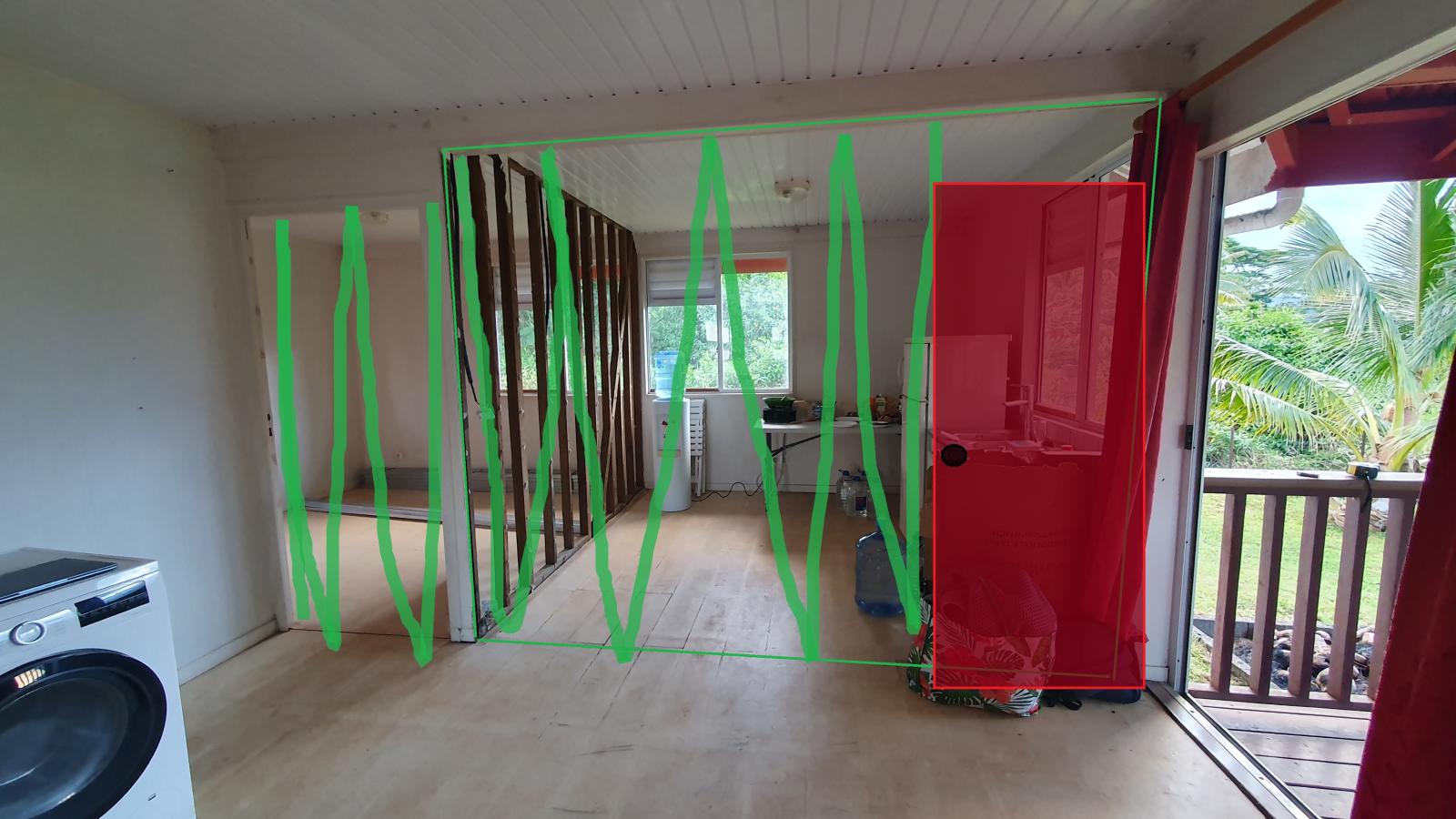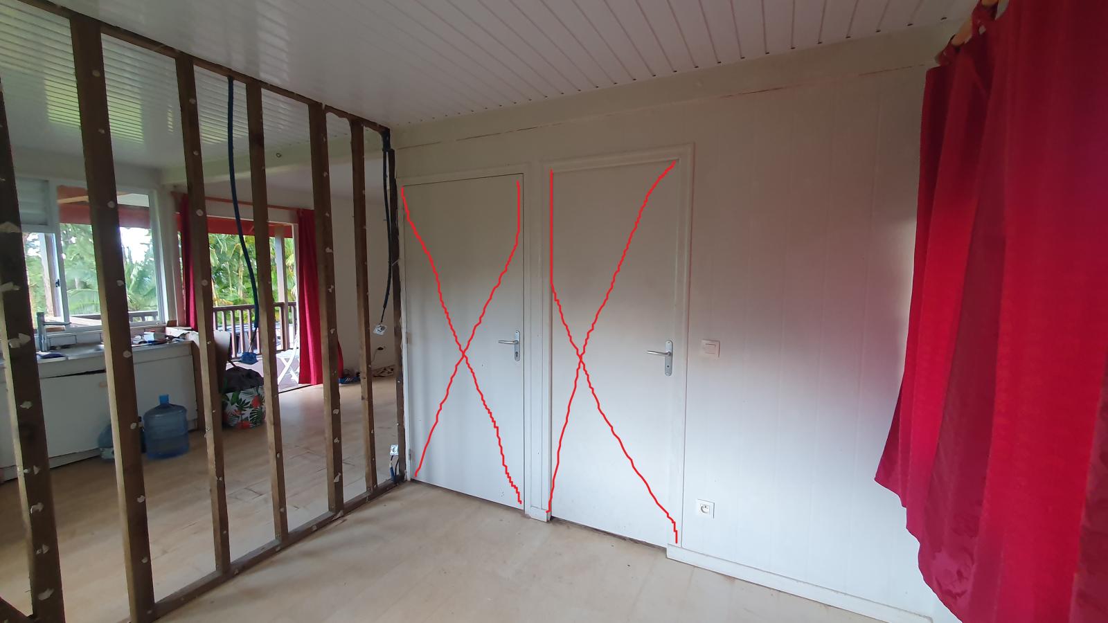 Le fichier joint contient deux plans. Le plan du haut montre en rouge la cloison et les deux portes à supprimer. Le plan du bas indique en rouge les deux nouvelles cloisons et les deux portes à installer.
