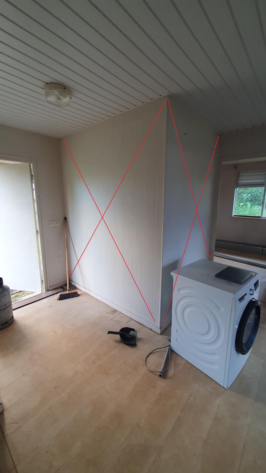 1 Démolition: Enlever une cloison ossature bois/clin fibro (200x240cm et 160x240cm), ainsi que deux blocs-porte (90x230cm).