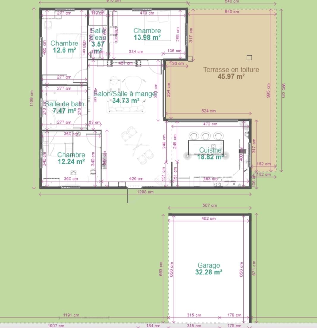 Construction d'une maison sur pilotis avec terrasse de 100 m2 environ + garage d'environ 35m2 sur un terrain de 1000m2 légèrement en pente. + terrain à clôturer. La maison comprend 3 chambres dont une parentale. Installation de panneaux photovoltaïques souhaités.