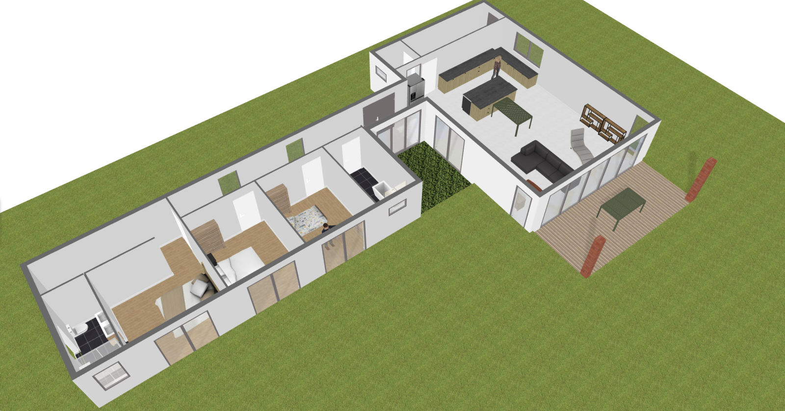 La maison est une maison en dur, de 150m2, composé de deux modules principaux (deux toitures).