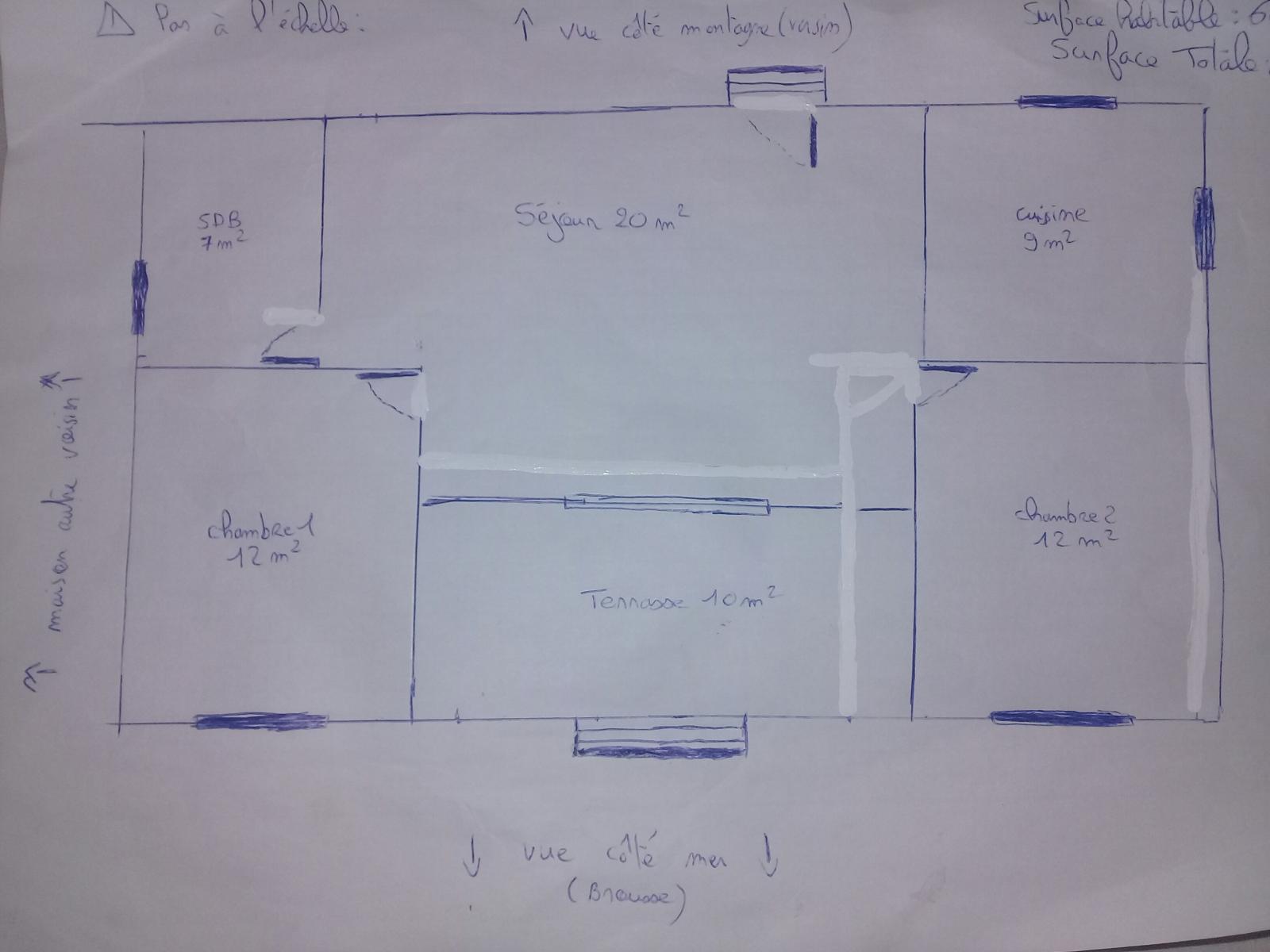 recherchons constructeurs immobiliers pour construire notre future maison de A a Z cle en main TTC en bois ou semi dur ( le plus rentable selon notre budget) des fondations dalle beton ou pilotis ainsi que les raccordements en eaux , electricite, plomberie , pose des sols et peinture ainsi amenagements int ( cuisine et salle de bain uniq.) d une surface totale de 70 m2 dont 60m2 habitable F3 2 chambre ,1 sdb, 1 sejour , 1 cuisine, 1 terrasse. je joins a cette demande une photo du plan que nous voulons qui n est pas a l echelle c est moi qui l est dessiné. voici les surfaces des pieces : Sejour : 20 m2 Cuisine : 9m2 Salle de bain : 7m2 Chambre 1 et 2 : 12 et 12m2 Terrasse : 10m2 ( Voir photo ci joint ) Nous attendons vos devis et vos meilleures proposition situe sur un terrain deja plat a Mahina cote montagne . Nous avons Deja vu avec notre conseillere bancaire pour notre projet avec avis favorable apres simulation notre de budget est d env 6 000 000 francs. Mauruuru