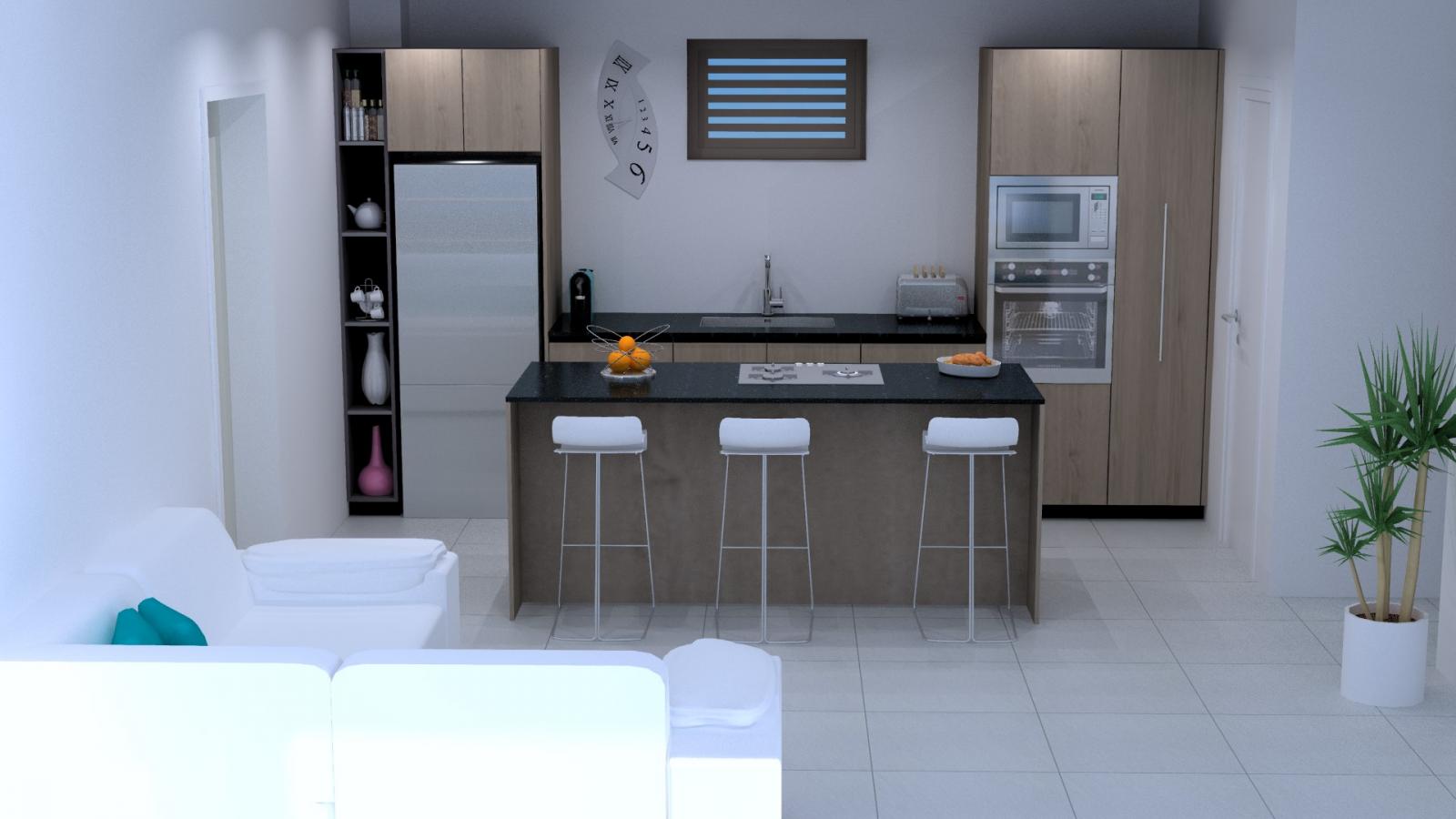 Ia Orana, Je vous contacte concernant un devis cuisine, pour un appartement se situant à la résidence sur Sky Nui appt 443 au 4ème étage. Concernant les matériaux utilisés, pour le plan de travail on partirait sur une matière Silestone et effet bois pour les placards. Pour les ouvertures de portes et placards sans poignets (a gorge métallique), avec un épicier sur le coté droit de la cuisine. Pour la partie ilot, les plaques seront à gaz donc prévoir un emplacement pour la bouteille de gaz et des casseroliers. Pour le mobilier on souhaite les encastrer. Se référer aux vues de 3D pour le rendu final. Sachant que nous restons ouvert a toute autre proposition pour le choix des matériaux ou aménagement des différentes colonnes.
