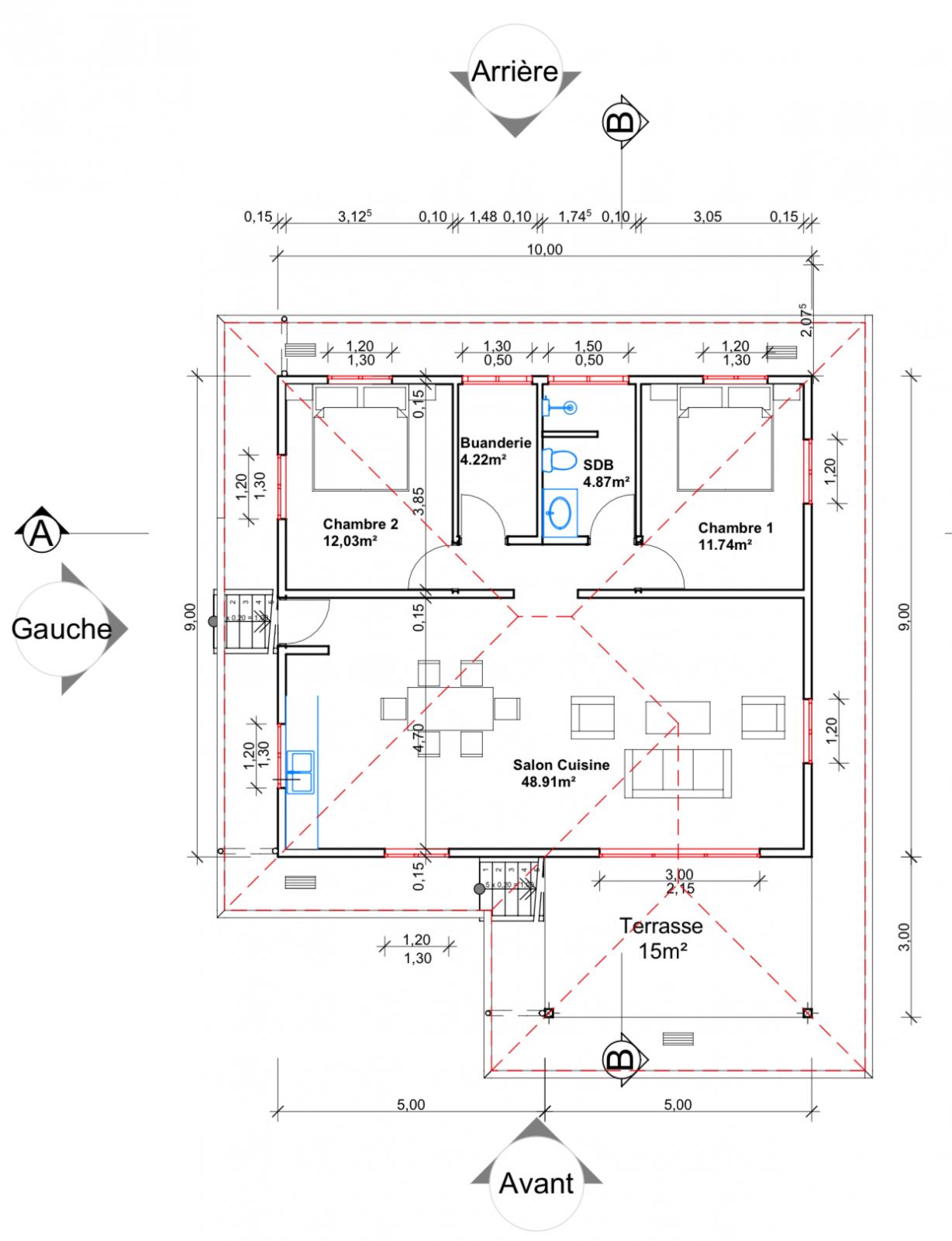 Demande devis pour la construction d’une maison clef en main d’une superficie de 105 m2 avec 2 chambres, 1 salle de douche, 1 buanderie, cuisine ouverte sur salon et terrasse de 15m2. Sur Mahina à la pointe Venus.