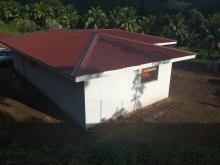 Il s'agit de repeindre la toiture de ma maison en vert : cette toiture neuve est de couleur rouge foncé qui tire au marron.La maison est située sur l'île de Moorea, dans la commune de Paopao. La surface totale de la toiture fait environ 155,6 m2.