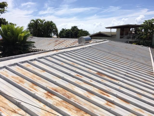 brossage de l'ancienne peinture, traitement anti-rouille des endroits qui le nécessite et traitement anti-rouille sur ces surfaces, peinture sur l'ensemble de la toiture pour une surface totale de 215 m2.