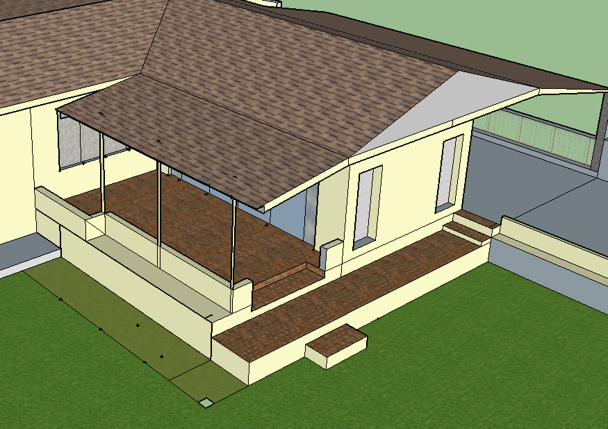 Maison âgé de 50 ans en dur, terrasse actuel de 3 m x 6 m environ. Souhait de changer les vieux carreaux, plafond actuel en pinex, souhait de remplacer en PVC. Souhait d'agrandir de 3,5 m, ce qui fera une surface définitive d'environ 36 m², toujours en dur, prolongation de la toiture actuelle de la terrasse afin de couvrir entièrement la terrasse actuel ainsi que l'extension.
