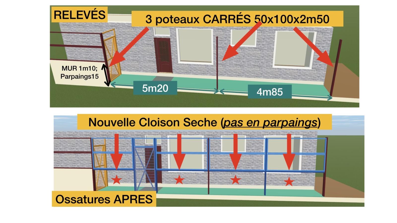 Fermer un trottoir avec une cloison sèche sur 1m10 de haut; avec du métal déployé sur la partie haute (2m50 de hauteur totale). Le trottoir fait 10m de longueur. Il y’a déjà 3 poteaux “carré de 50x100” : le 1er au début du 10m, le 2eme au milieu; et le 3EME à la fin. Mauruuru (Travail pour soudeur)