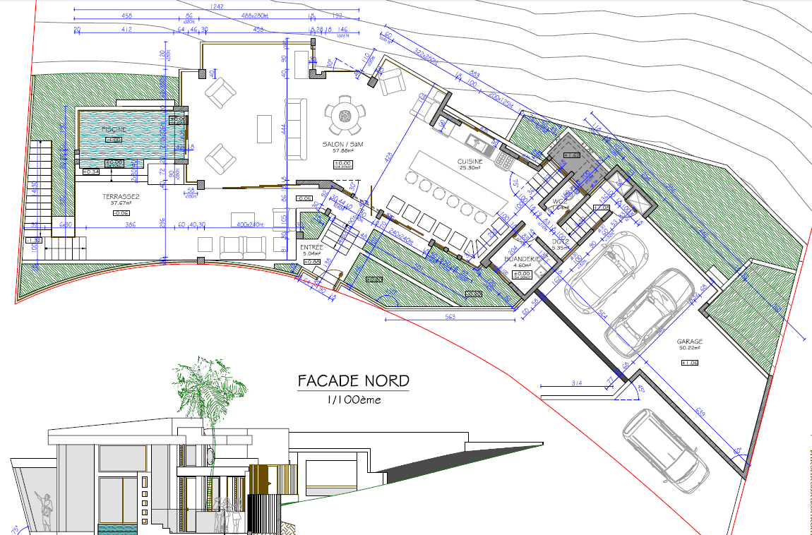 3 Ch, 2 SDB et WC, garage, buanderie, 1 salle de sport = niveau moins un. Cuisine, salon, séjour + terrasse+ piscine = niveau + un. Terrain en pente avec piscine, maison style moderne béton/verre, pas de carrelage (sol résiné). 211m. carré habitable, terrasse 43m. carré, garage 50m. carré. Toit tôle + béton.
