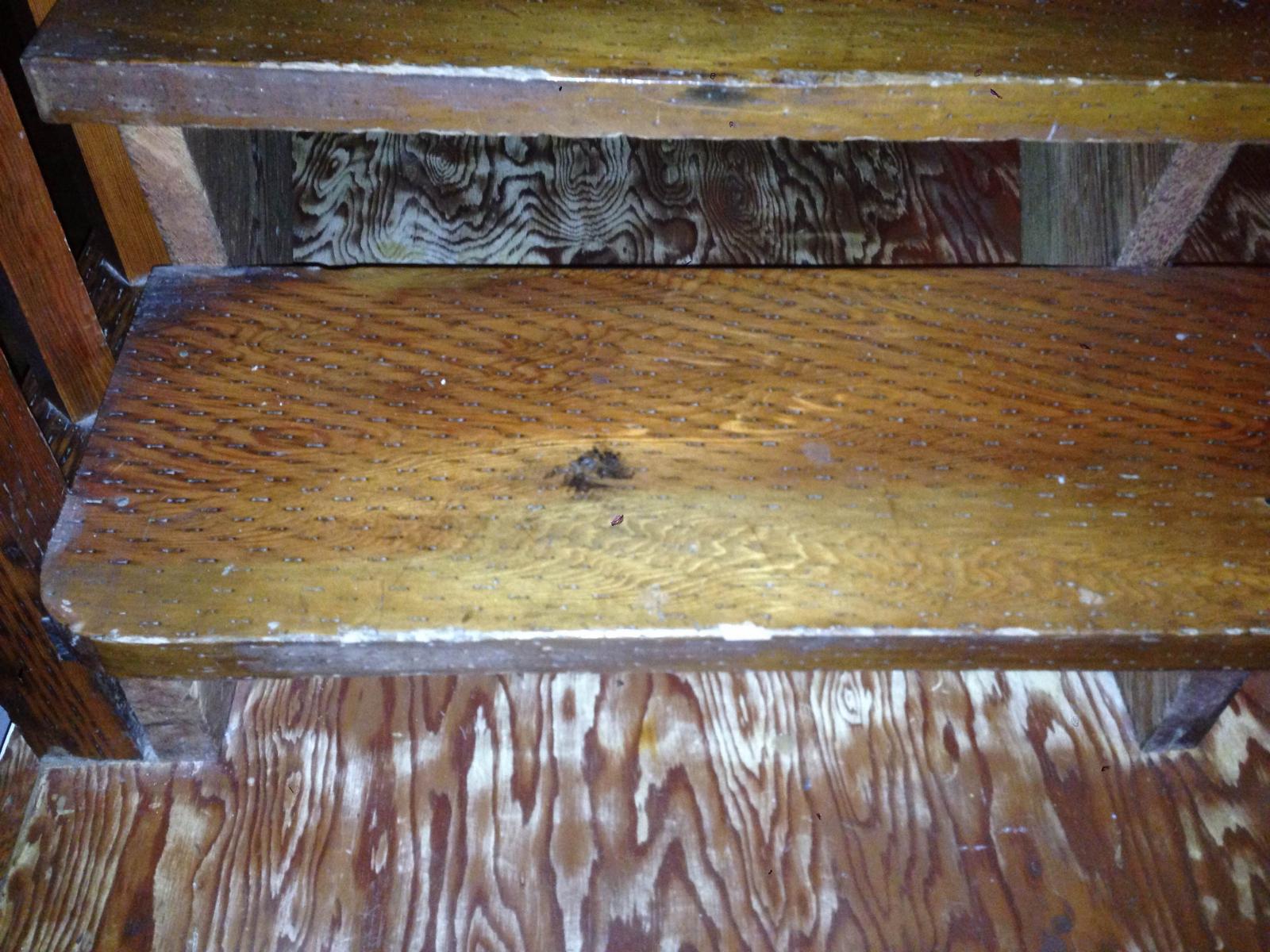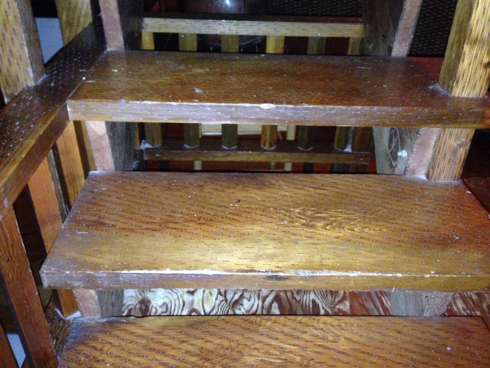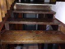Escalier en bois vernis dont les marches ont été abîmées.