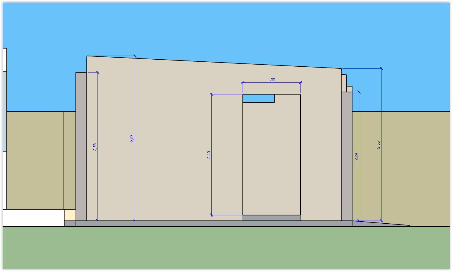 dalle beton 6,00 X 10,50 x 0,10, charpente metalique, toiture tole 1 pente, 5 poteaux, local de rangement (2,50X5,00) en parpaing