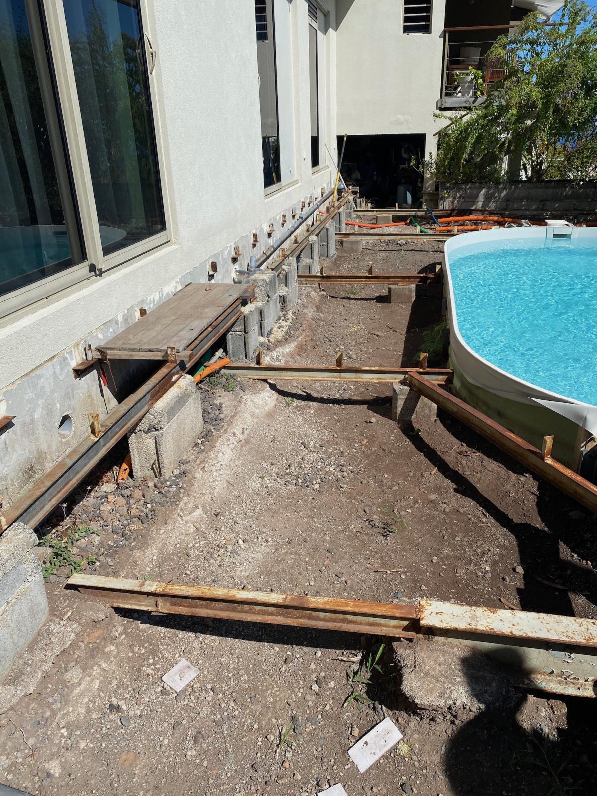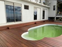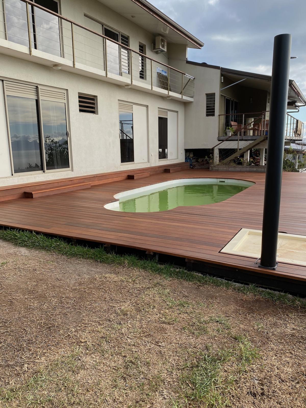 - Réalisation d'un banc sur toute la longueur du deck et de marches pour accéder directement aux pièces bordant la piscine